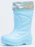 Водонепроницаемые сапожки для девочки небесно-голубого цвета с тёплым вкладным чулком подходят как для летней ненастной погоды, так и для демисезона. - Сапожки сделаны из ЭВА (этиленвинилацетат) - невероятно легкого и амортизирующего материала, не скользящего и не натирающего ноги. - Текстильный чулок с содержанием хлопка 80% укомплектован тёплой войлочной стелькой. Ноги ребенка будут \'дышать\' и, в то же время, находиться в тепле. - Манжет с красивым принтом надёжно затягивается на голенище с помощью резинки с фиксатором, что предотвращает попадание влаги через верх сапога внутрь.